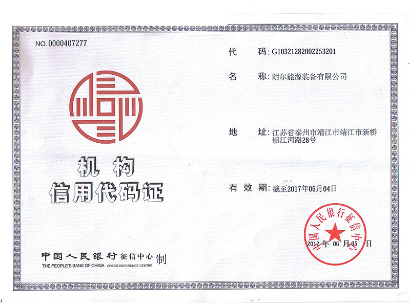 耐爾能源裝備有限公司機(jī)構(gòu)信用代碼證